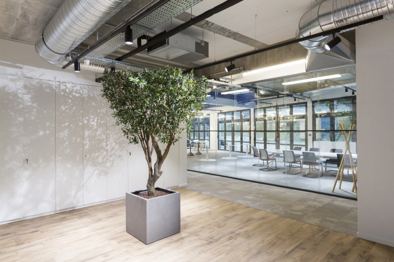 Installation d’un système de climatisation à détente direct type VRV de marque Daikin + unités intérieures cassettes 600×600 et gainables. Mise en œuvre d’un réseau aéraulique d’apport d’air neuf et d’air repris en gaine galvanisé depuis les attentes immeuble. Création d’un réseau type kryoclim pour alimenter des Ventilo Convecteurs 2tubes/2fils en eau glacée. Chauffage par résistance électrique. Conception et travaux apparents en synthèse avec lots architecturaux